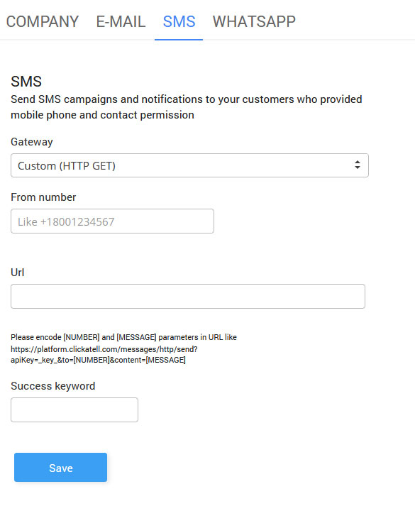 You can choose one of the integrated platforms like Twilio or Clickatell, or configure a custom one.