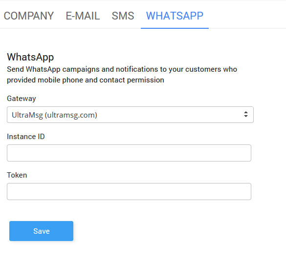 WhatsApp setup requires that you specify the Instance ID and Token.