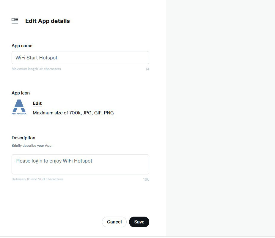 Login to the Antamedia Cloud WiFi portal and go to the Splash page / Social Network Configure tab.