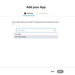 On the App set up tab click Add an existing App button, and select the previously created App. From the Confirmation tab click Go to dashboard.