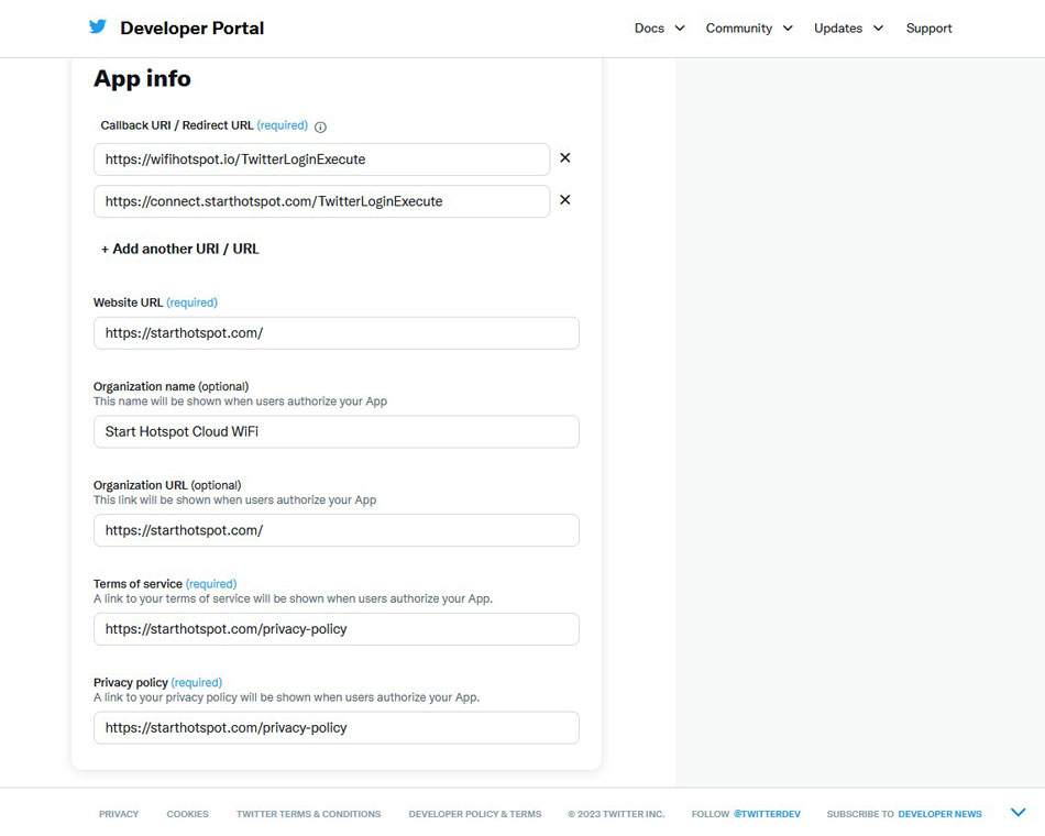 Set your Organization name, URL, Terms of service, and Privacy policy URLs.