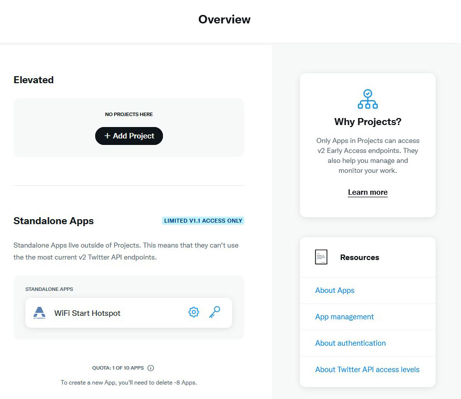 Go to Projects & Apps, click Create New App and complete Twitter project questions.