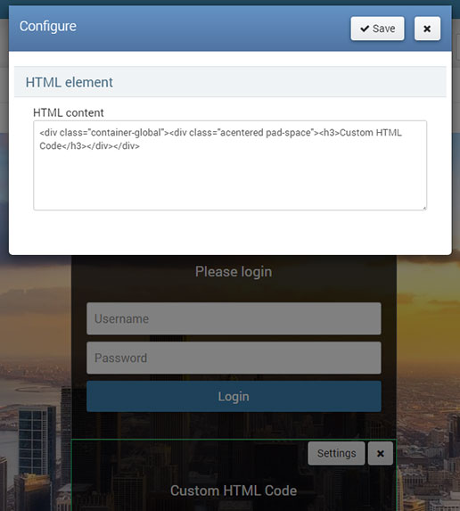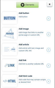 From this section is possible to Add Elements like Button, Image, Article, Link, HTML code.
