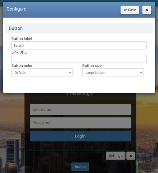 Here is required to set Button label, Link URL address, Button color (Default, Primary, Success, Info, Warning, Danger) and Button size (Large, Default, Small, Extra Small).