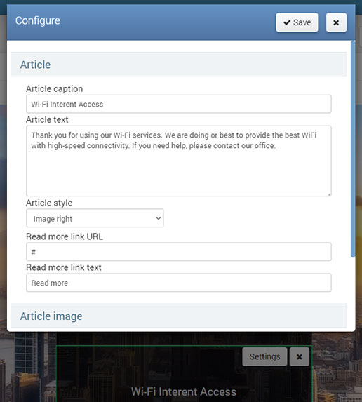 Article caption, Article text, select Article style (Image Right, Image Left), Read More Link URL, and Read More Link Text.