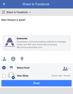 Or you can set User login method and enable the Welcome page with Ads and FB share. Your guest will get a Welcome page with video or image ad and FB share widget and he will need to share your page on the Facebook wall to get the Internet access. If wants, the user writes the post or he can leave this field empty and just share your page.