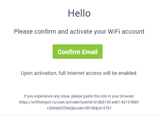 Upon connecting to the WiFi, activation link will be sent to customer email. Customer will click the link to confirm email and unlock full Internet access.