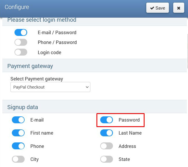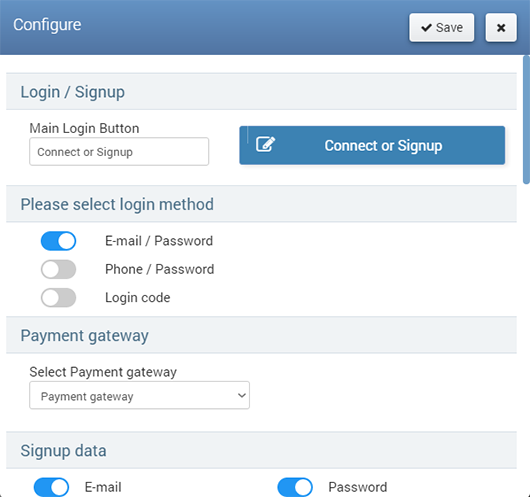 Select Login method, Payment gateway, and set customer details that will be required in the signup process.