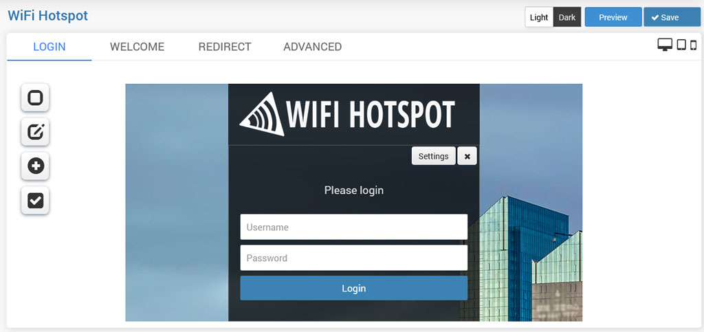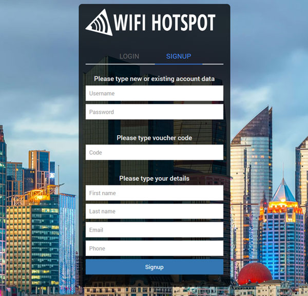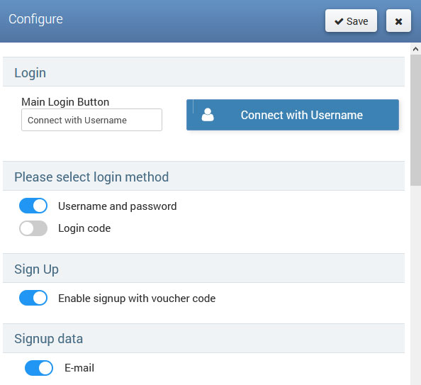 In Settings, can be set MainLogin button text, select login method Username and password or Login code and optionally enable Signup with voucher code.