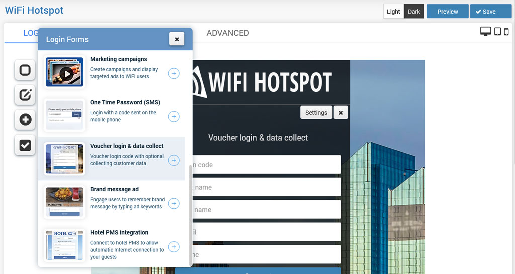 Voucher login & data collect can be configured from the Settings page configuration menu.